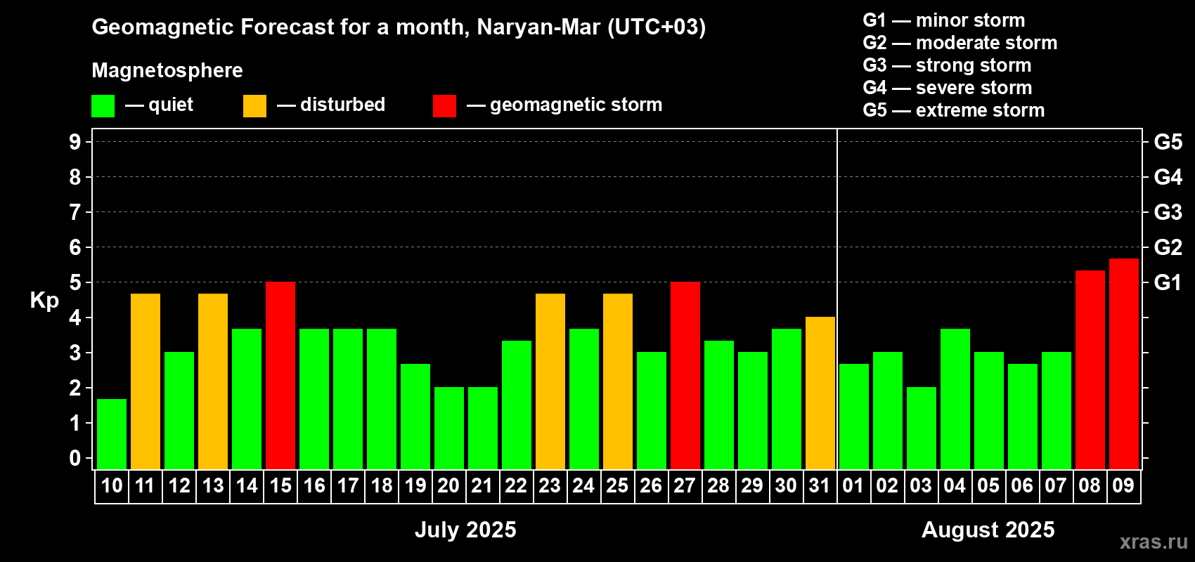 Geomagnetic storm forecast in Naryan-Mar for Jul 10, 2025