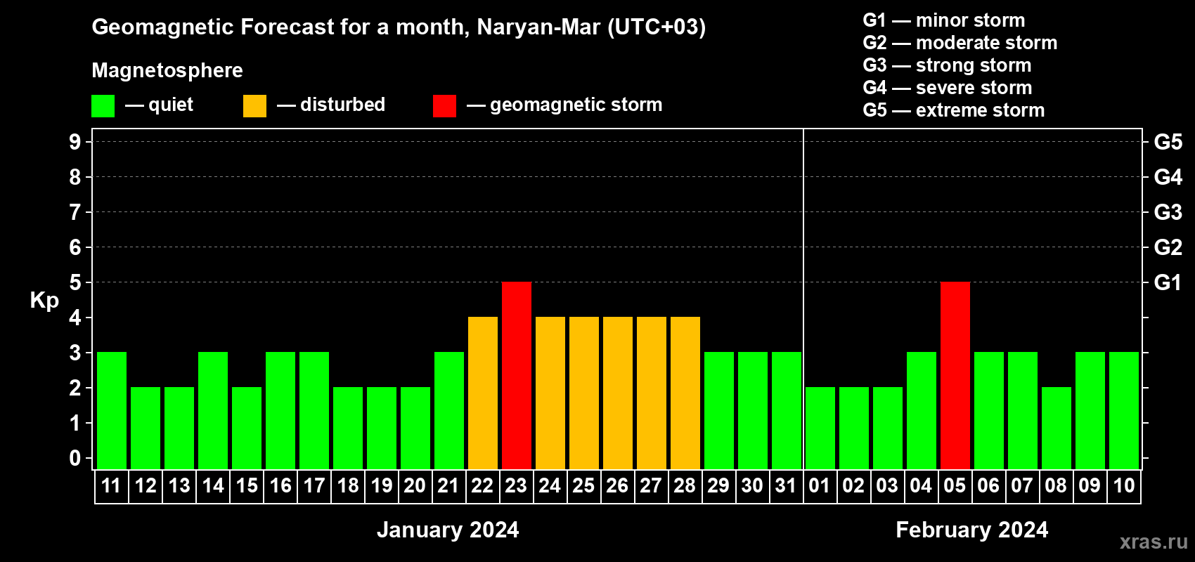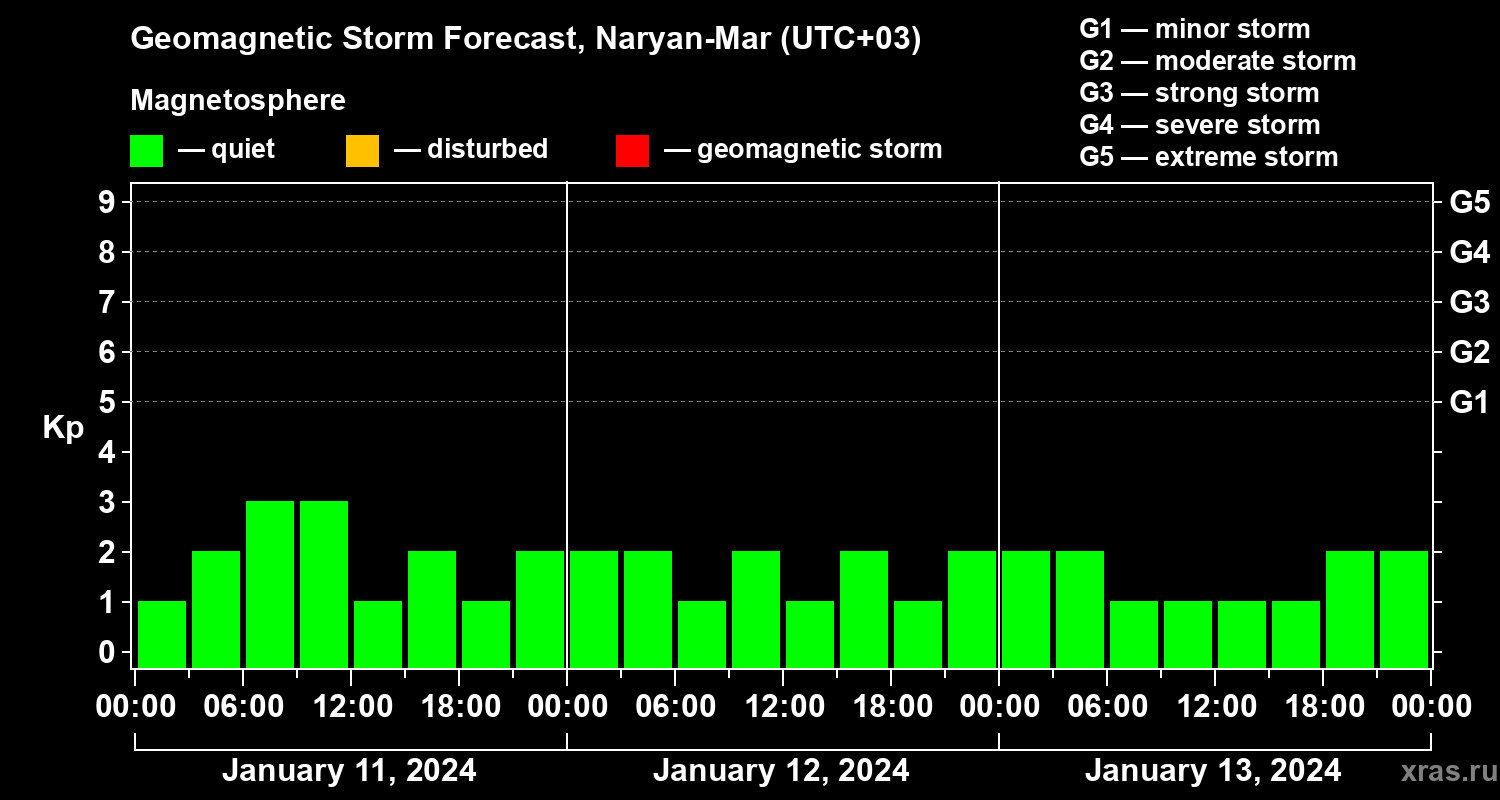 Geomagnetic activity forecast in Naryan-Mar — Jan 11, 2024