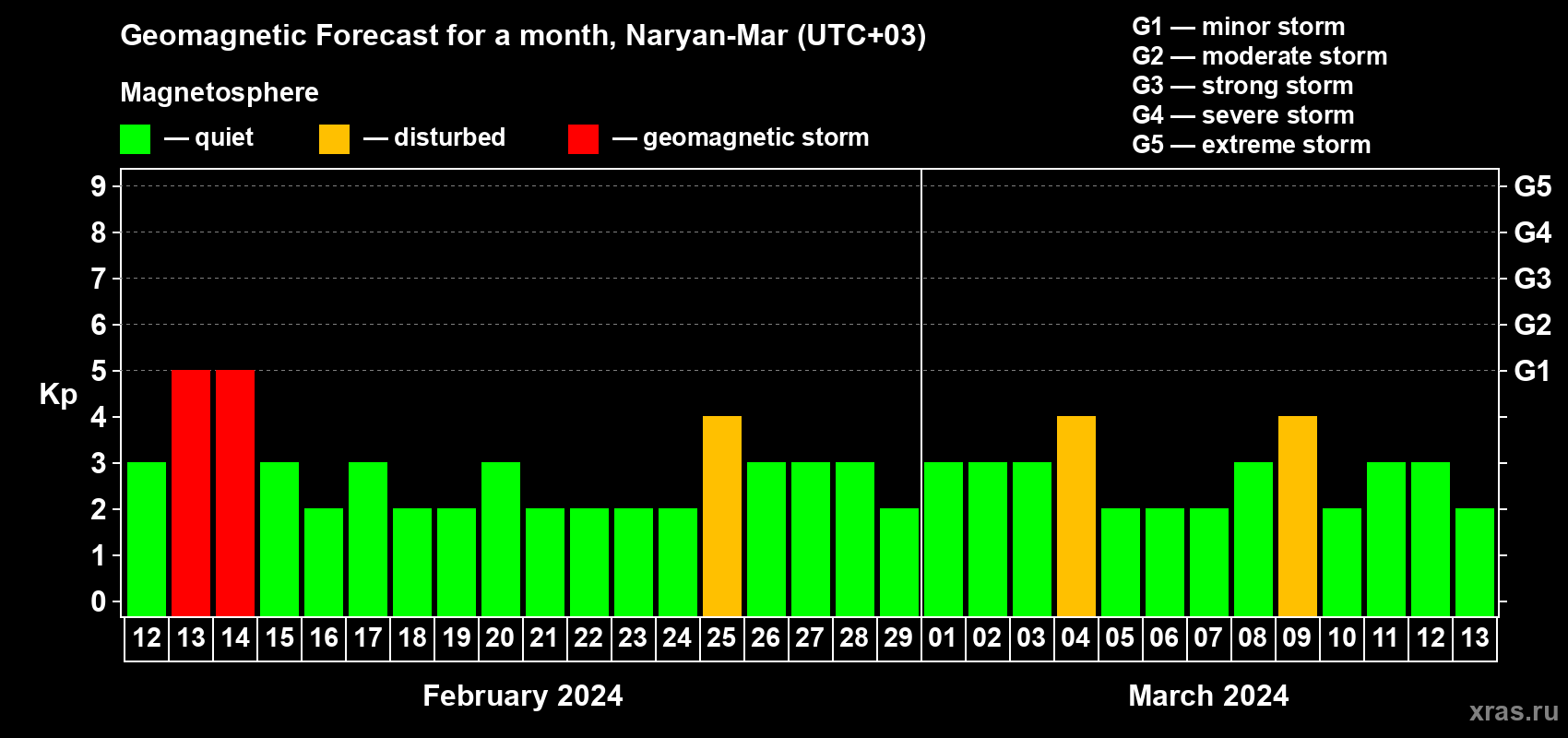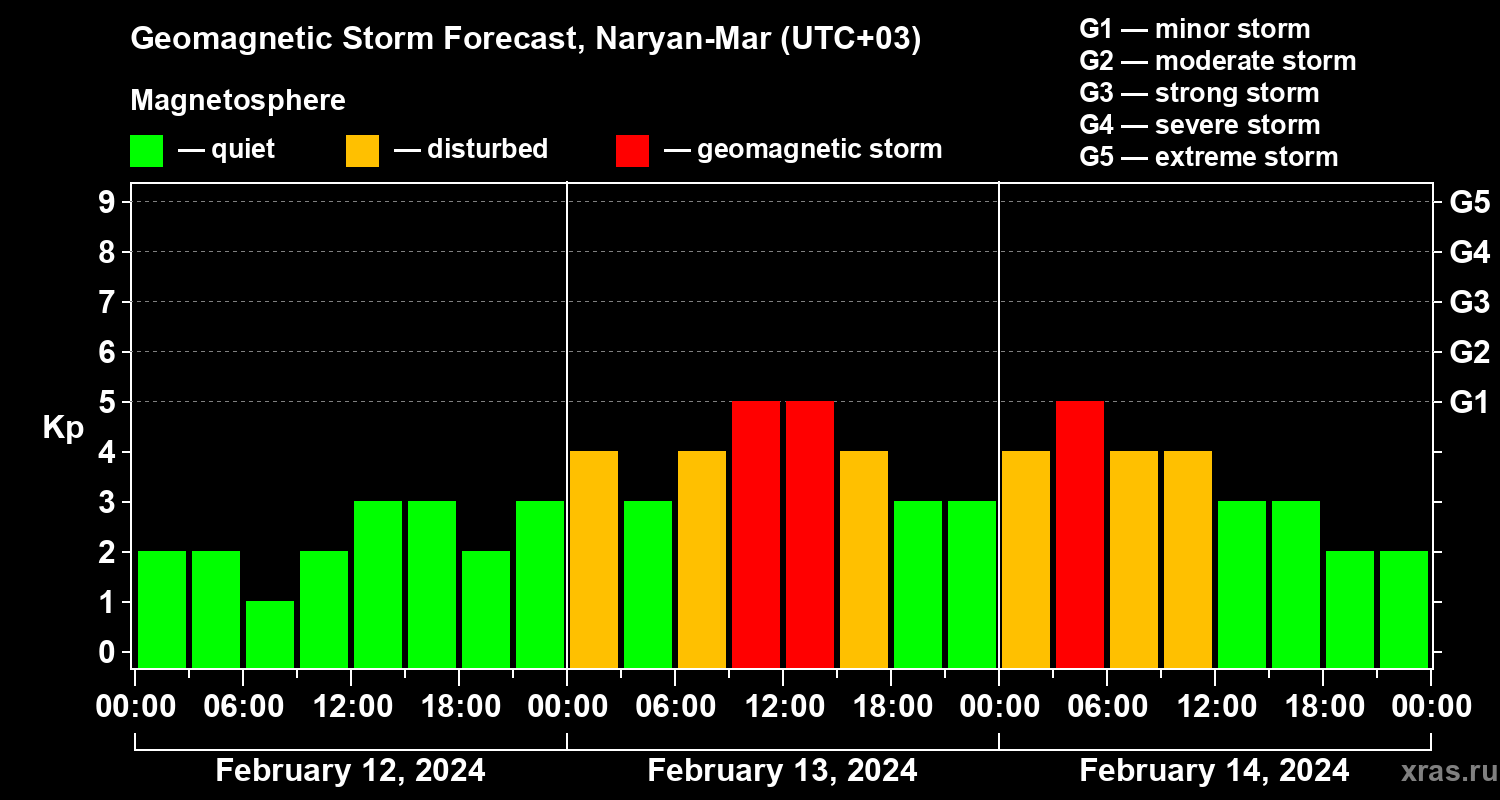 Geomagnetic activity forecast in Naryan-Mar — Feb 12, 2024