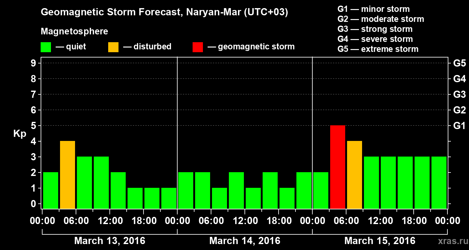 Geomagnetic storm forecast in Naryan-Mar for Mar 13, 2016