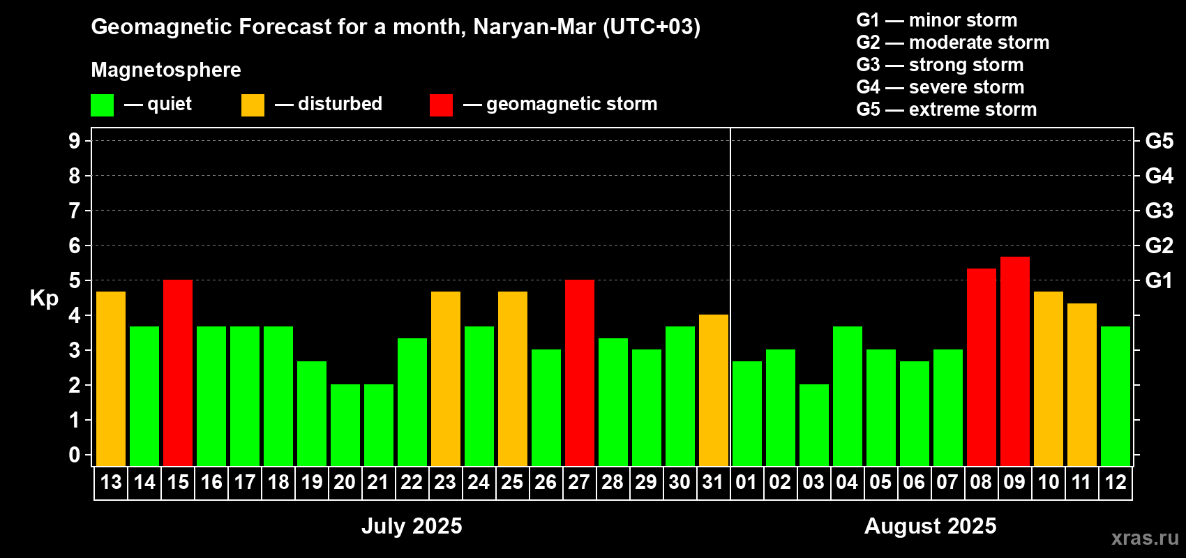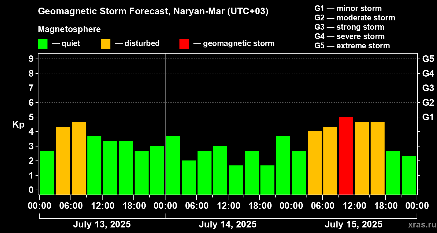 Geomagnetic storm forecast in Naryan-Mar for Jul 13, 2025