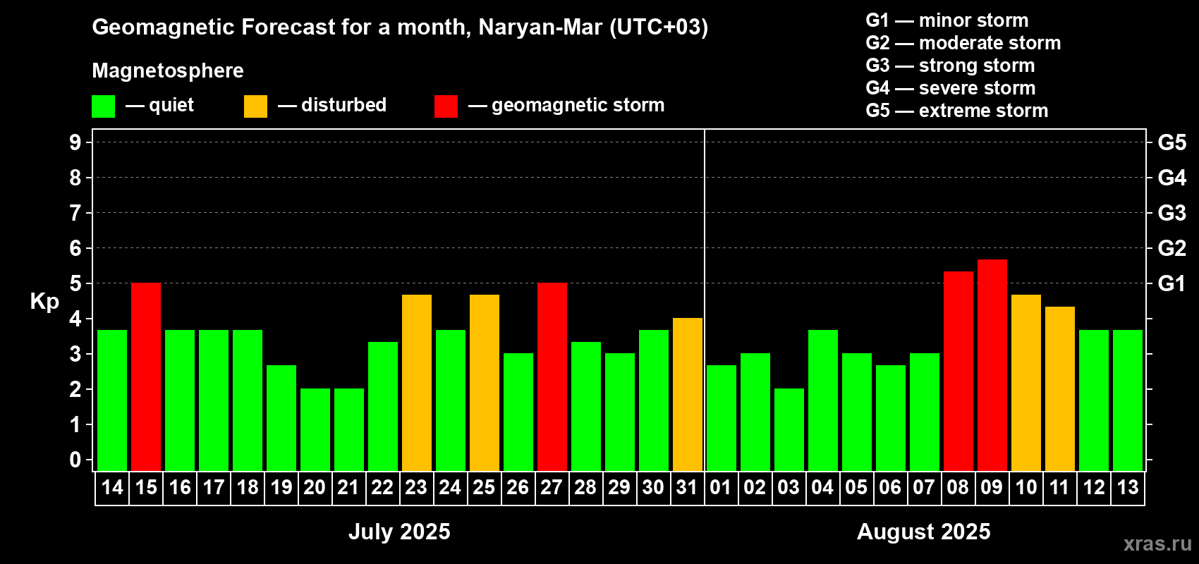 Geomagnetic activity forecast in Naryan-Mar — Jul 14, 2025