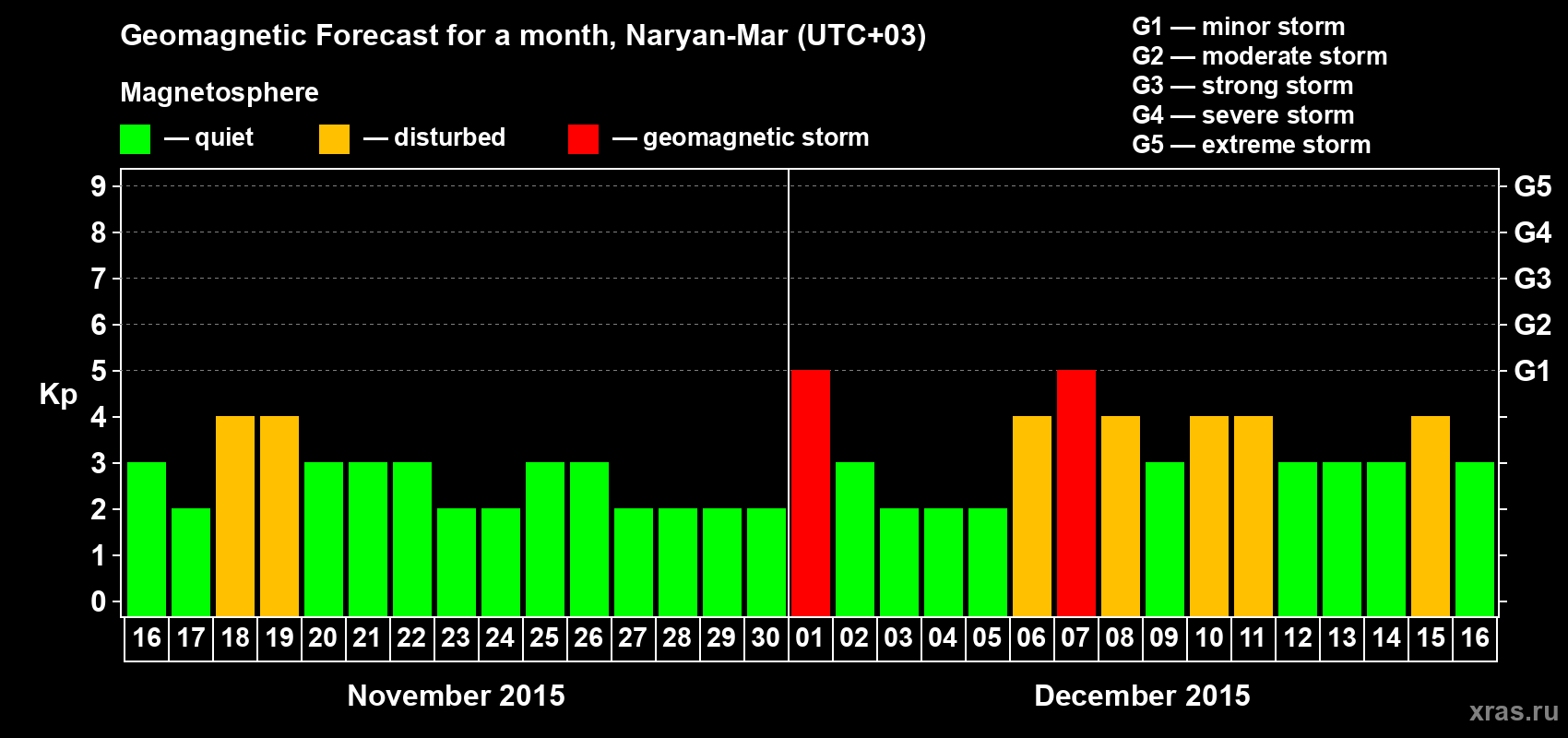 Geomagnetic activity forecast in Naryan-Mar — Nov 16, 2015