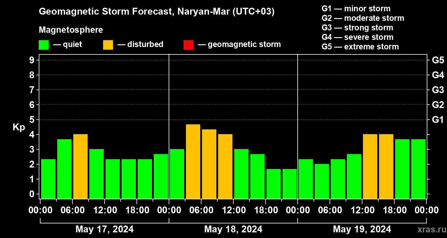 Geomagnetic activity forecast in Naryan-Mar — May 17, 2024