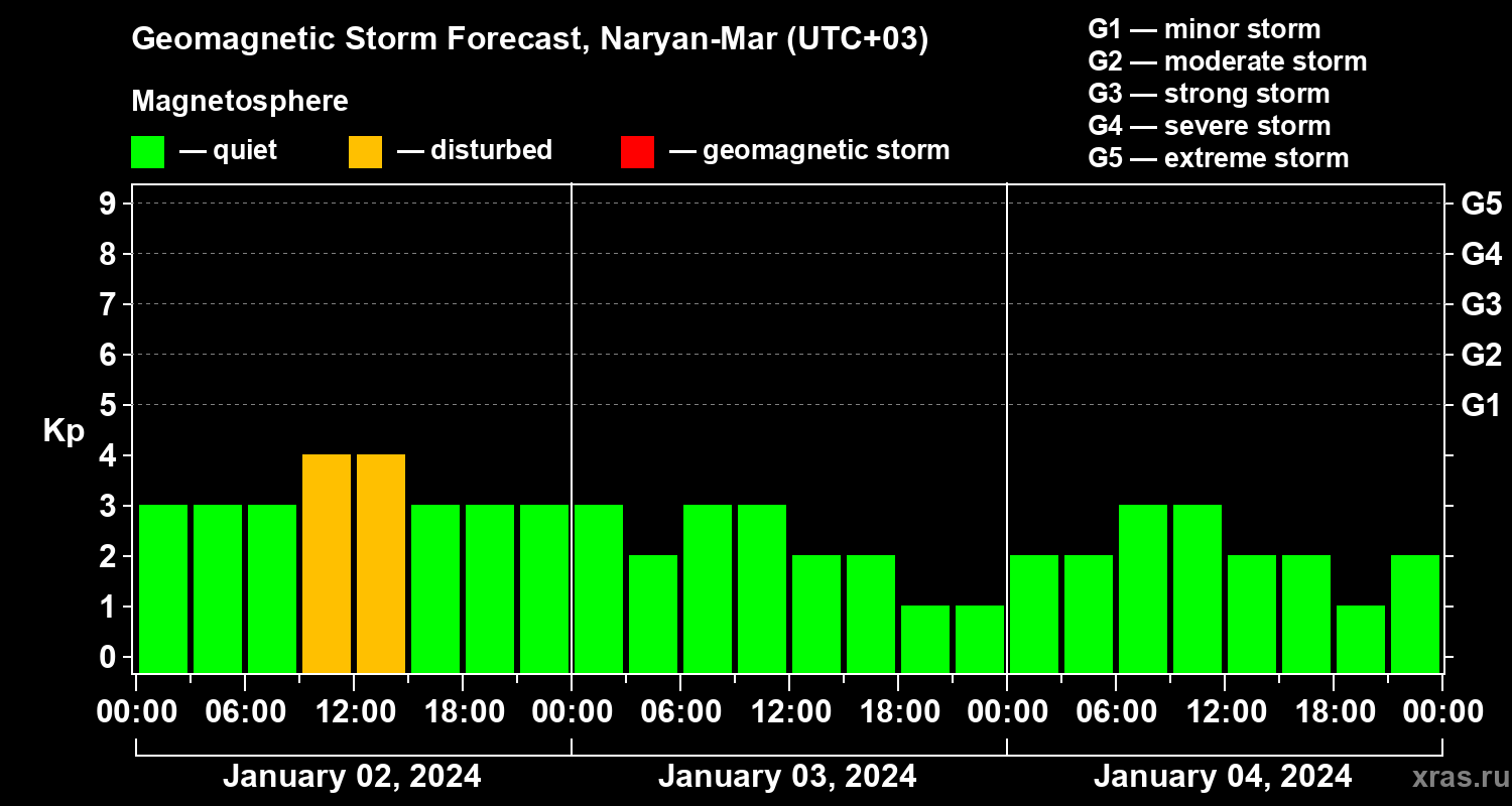 Geomagnetic activity forecast in Naryan-Mar — Jan 02, 2024