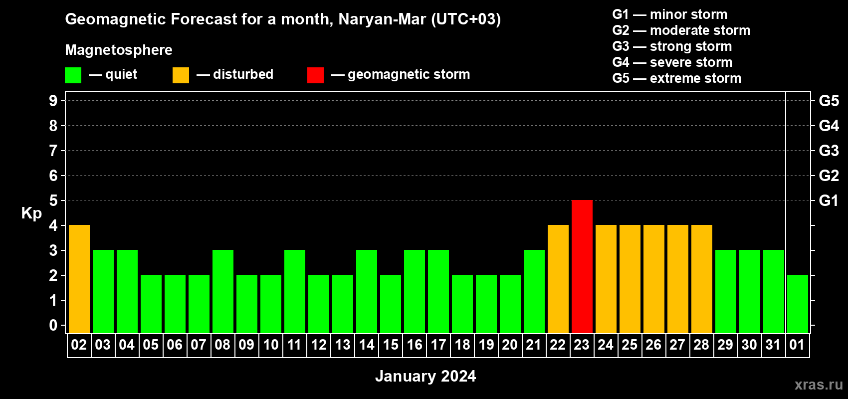 Geomagnetic storm forecast in Naryan-Mar for Jan 02, 2024