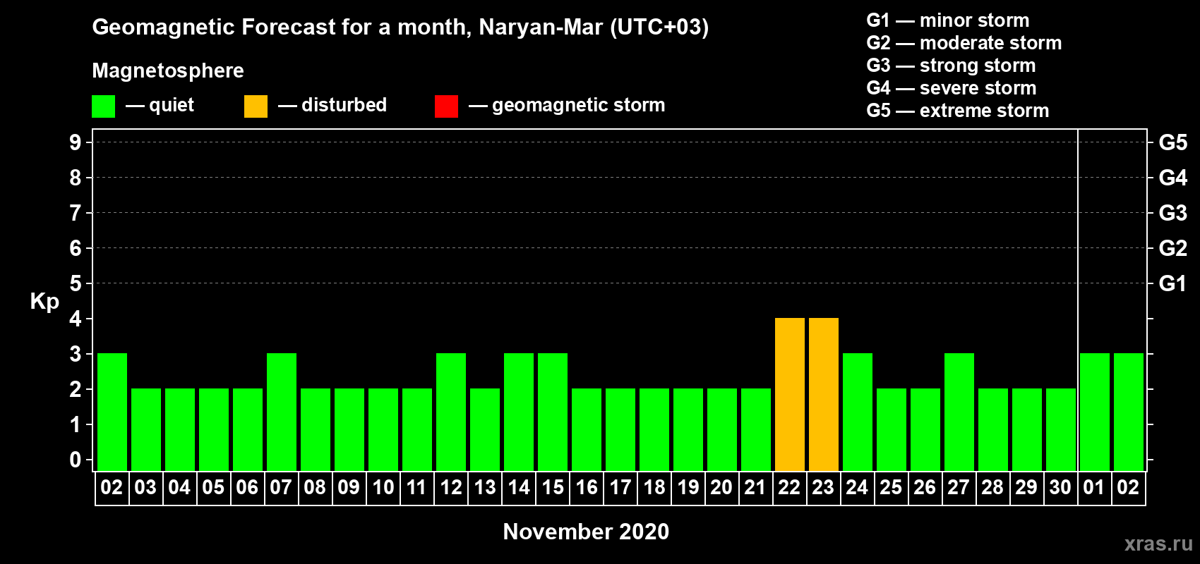Geomagnetic activity forecast in Naryan-Mar — Nov 02, 2020