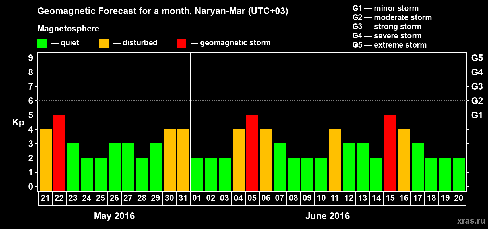 Geomagnetic activity forecast in Naryan-Mar — May 21, 2016