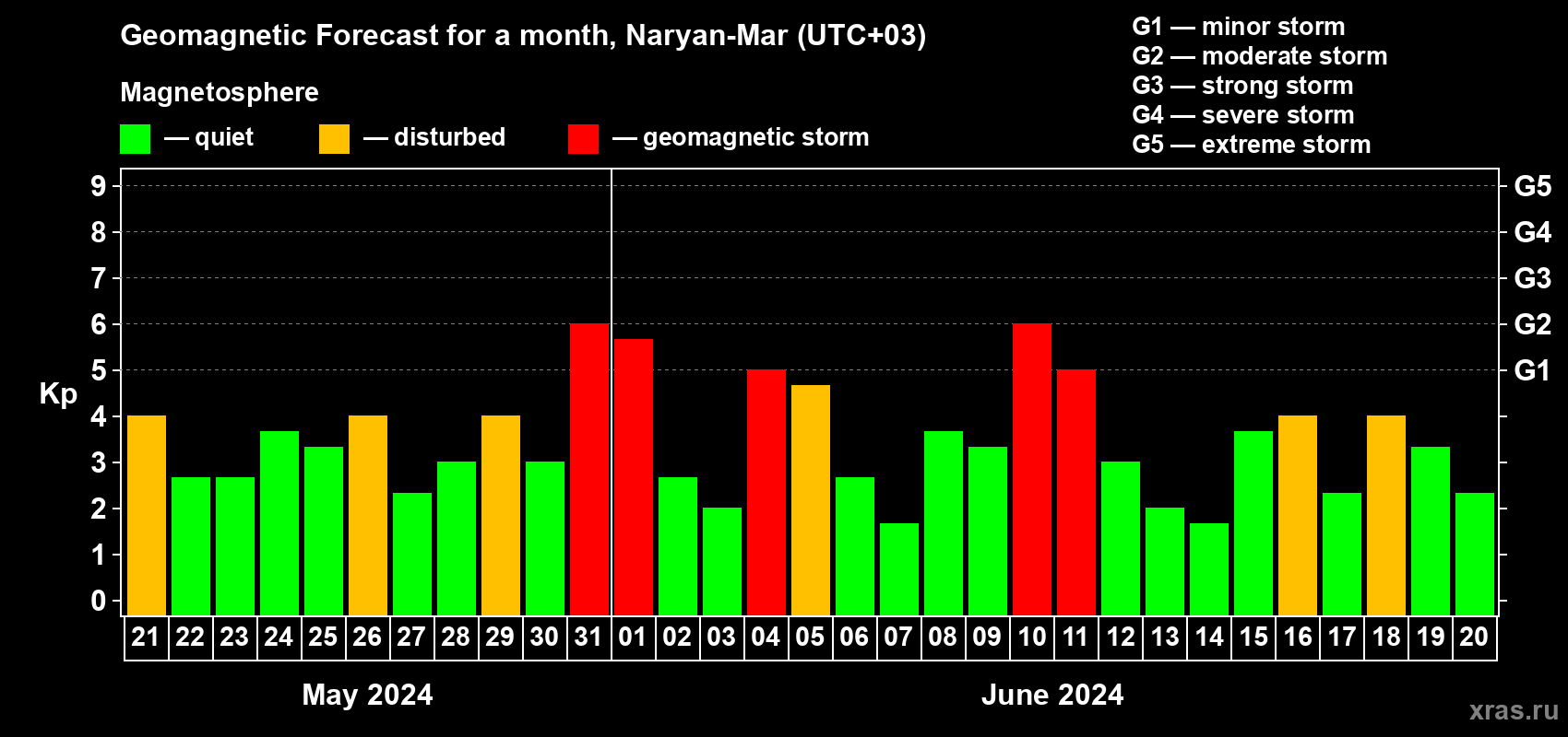 Geomagnetic activity forecast in Naryan-Mar — May 21, 2024