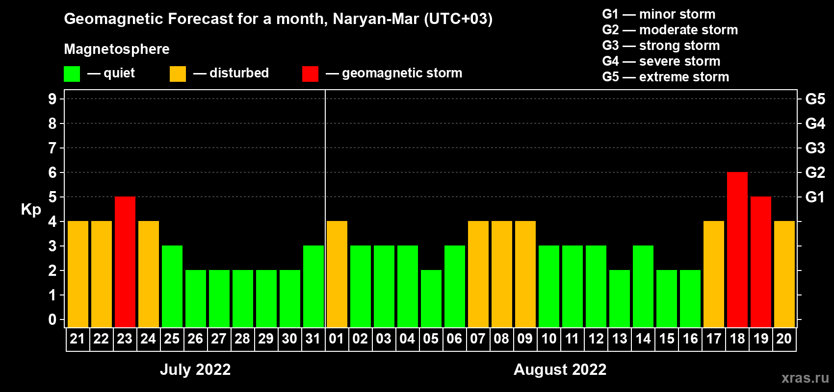 Geomagnetic storm forecast in Naryan-Mar for Jul 21, 2022