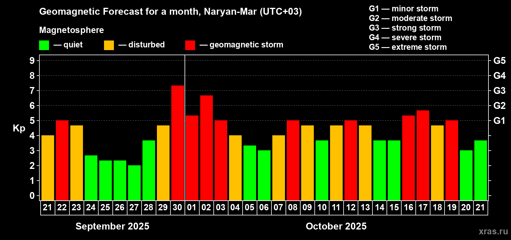 Geomagnetic storm forecast in Naryan-Mar for Sep 21, 2025