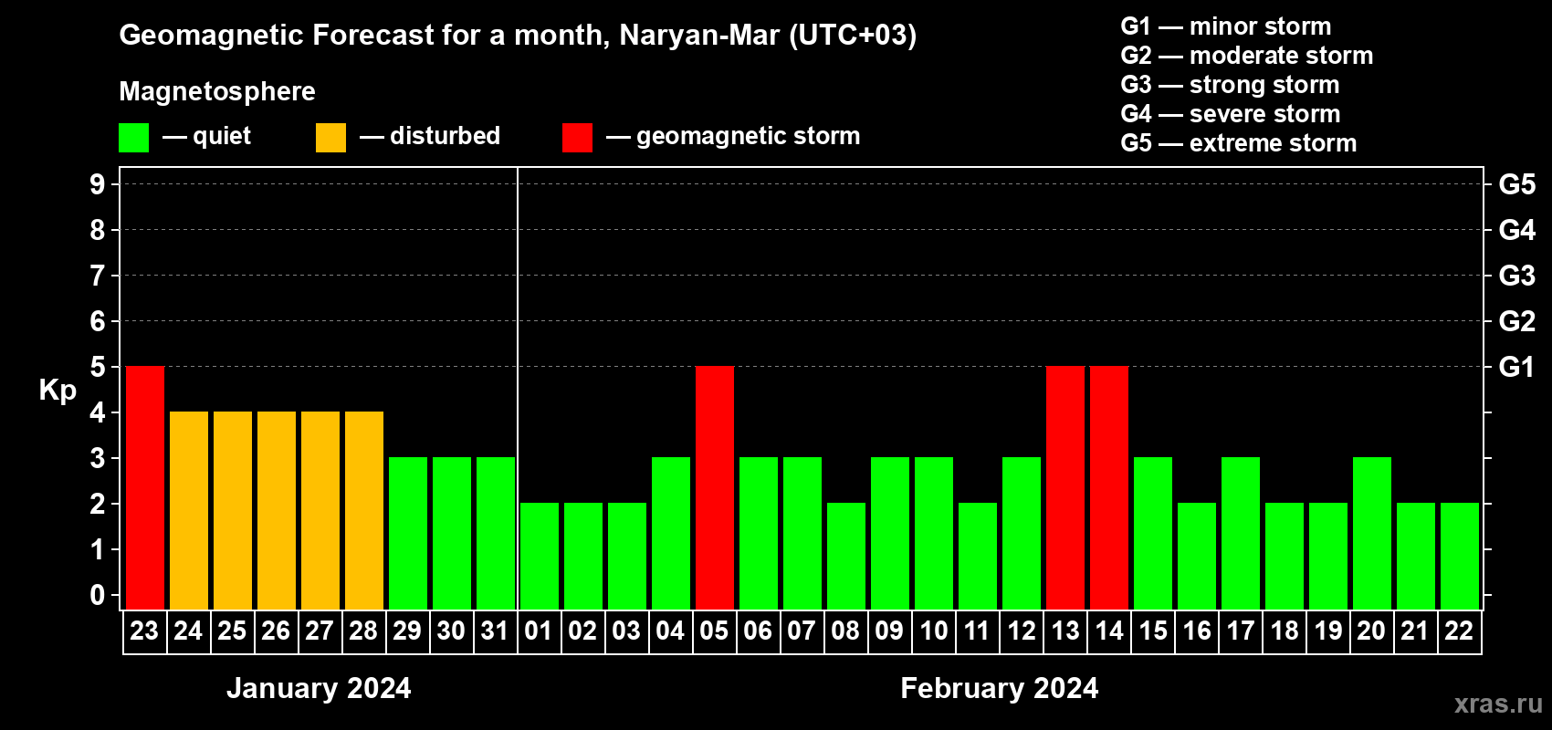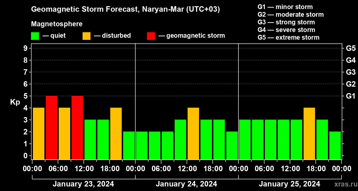 Geomagnetic activity forecast in Naryan-Mar — Jan 23, 2024