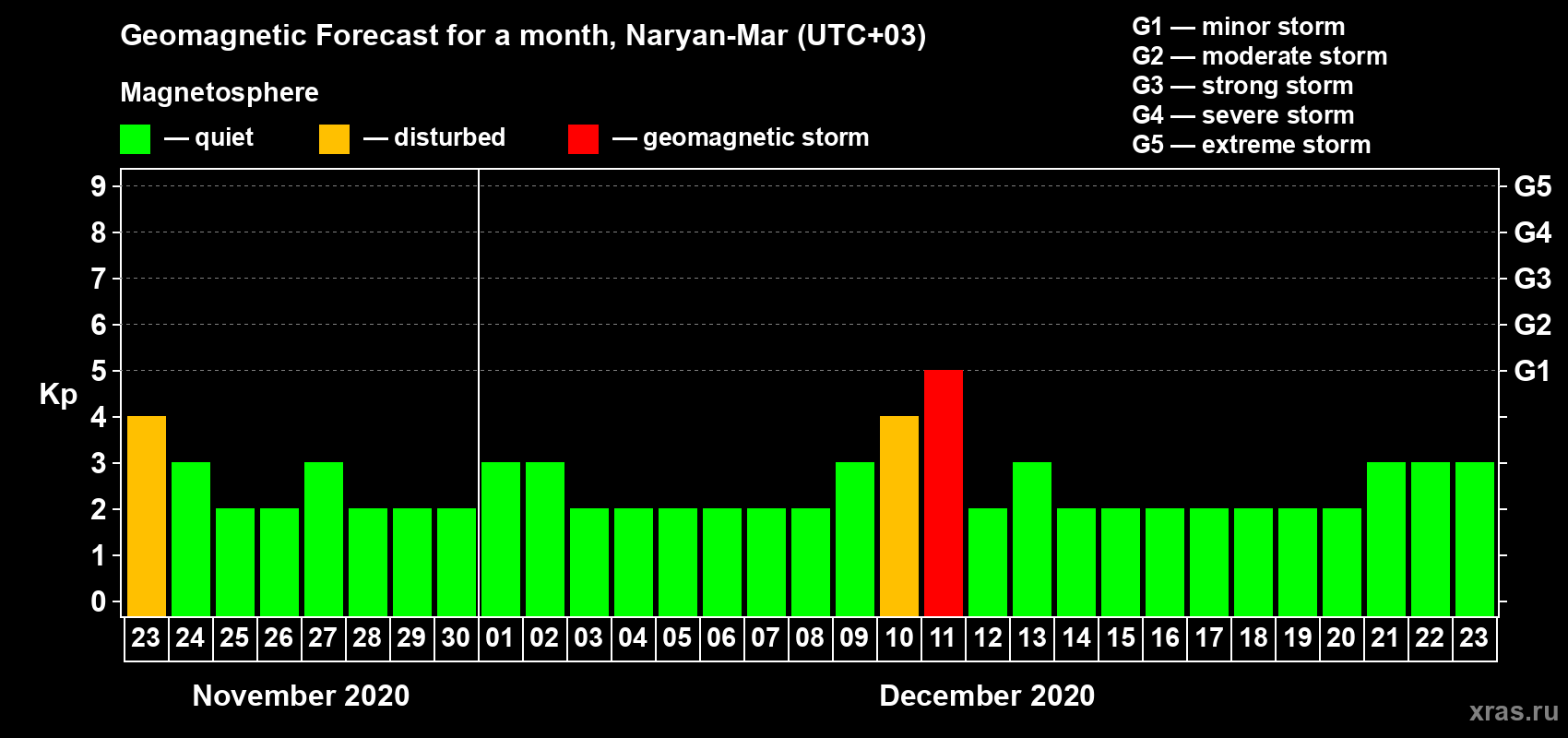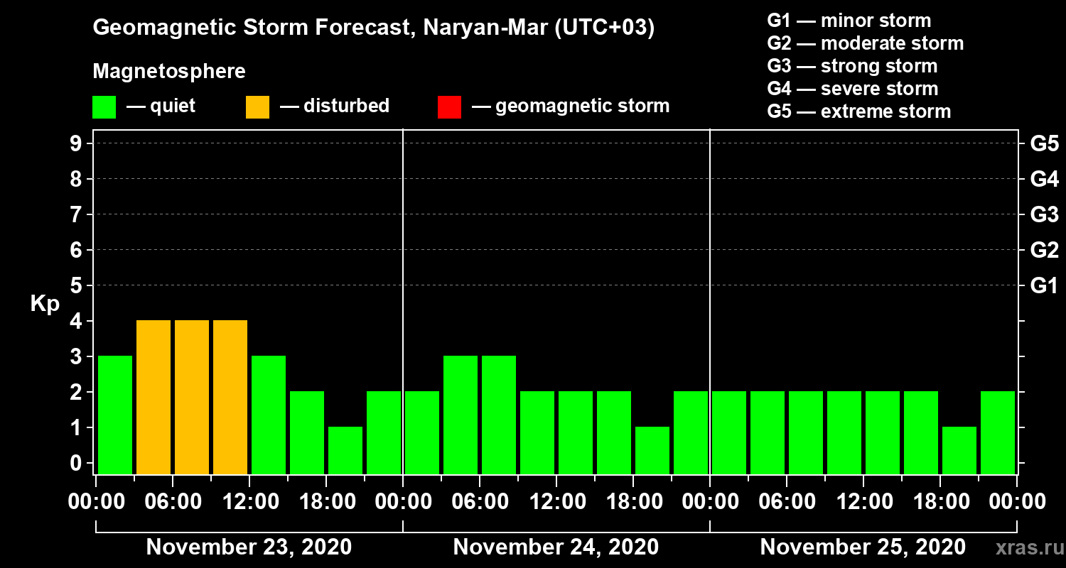 Geomagnetic activity forecast in Naryan-Mar — Nov 23, 2020