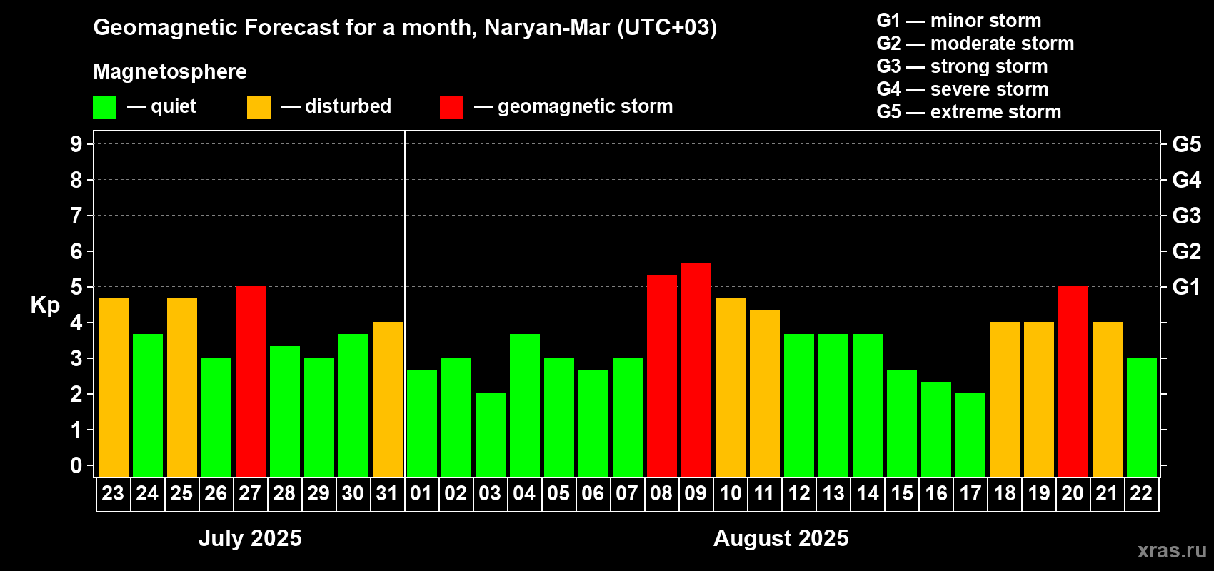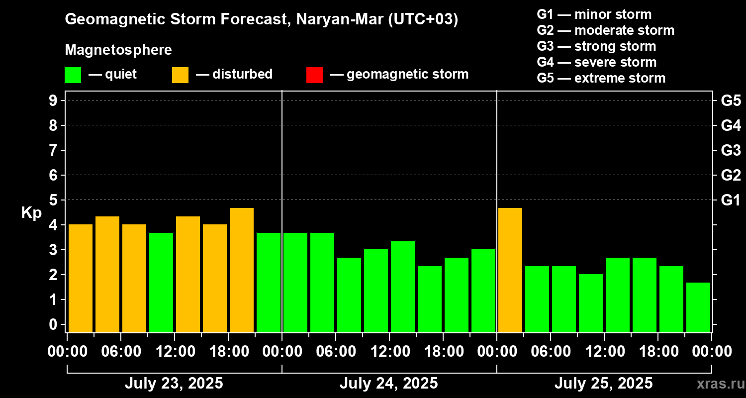 Geomagnetic activity forecast in Naryan-Mar — Jul 23, 2025