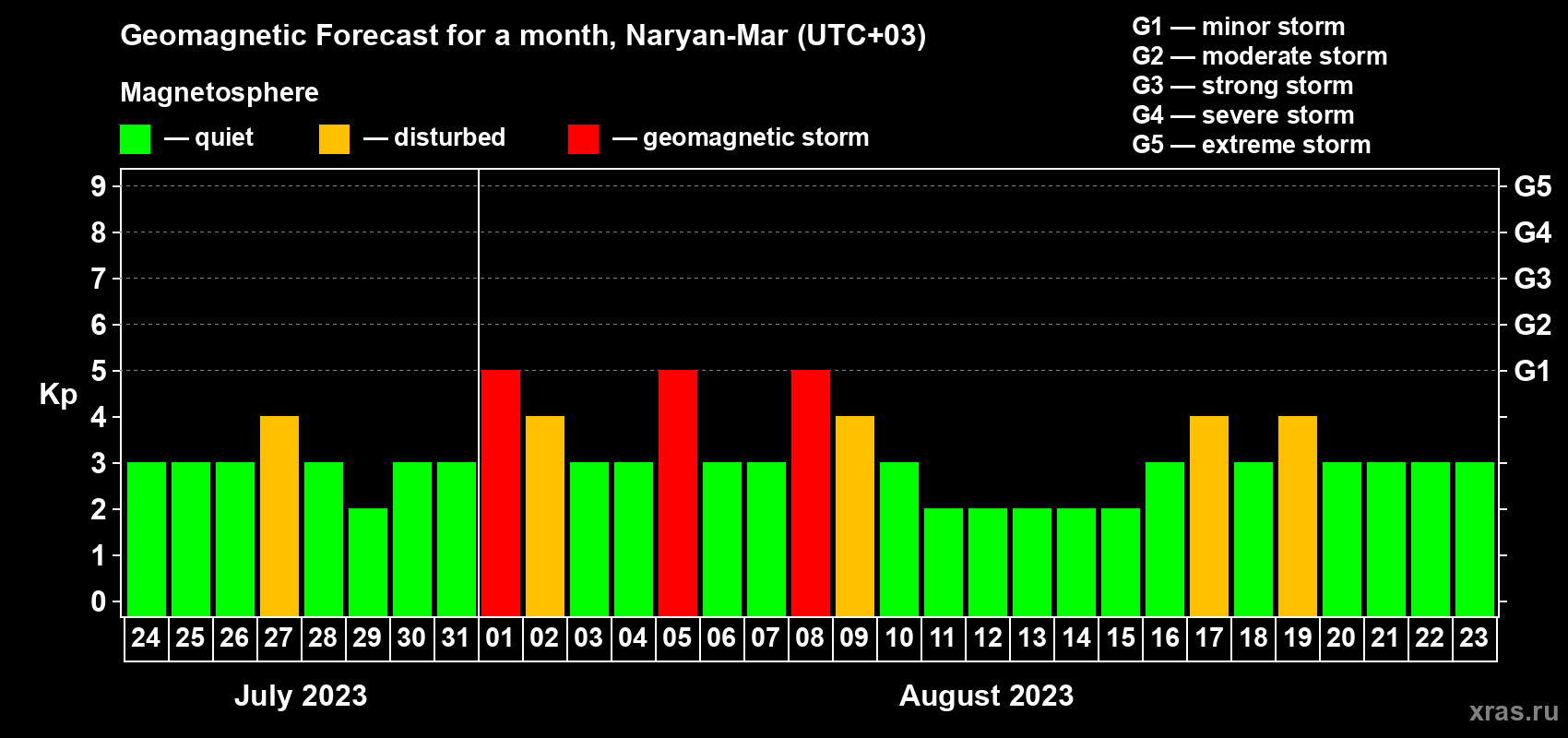 Geomagnetic storm forecast in Naryan-Mar for Jul 24, 2023