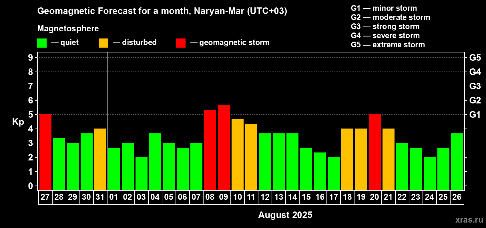 Geomagnetic activity forecast in Naryan-Mar — Jul 27, 2025