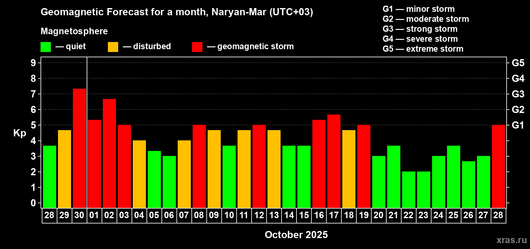 Geomagnetic activity forecast in Naryan-Mar — Sep 28, 2025