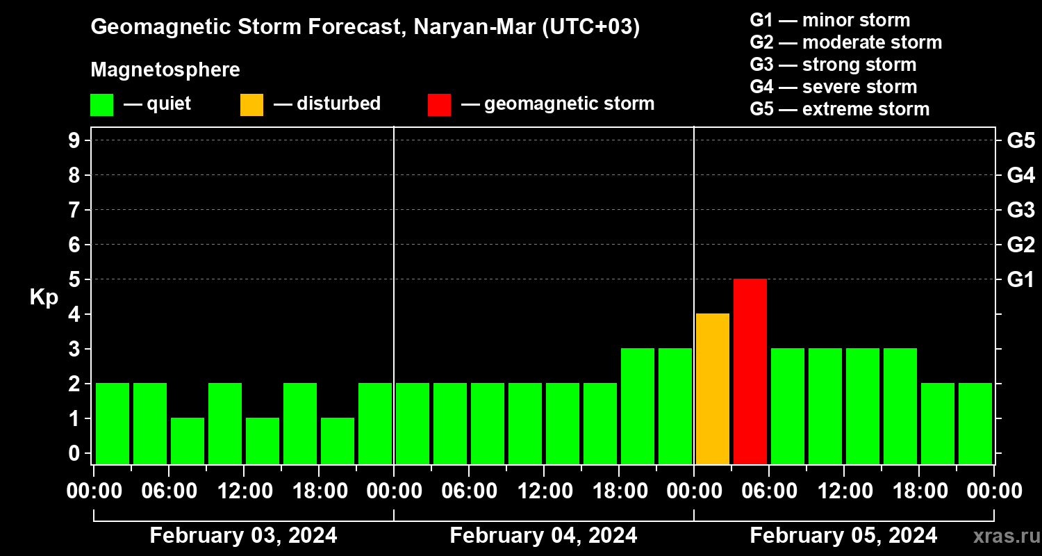 Geomagnetic storm forecast in Naryan-Mar for Feb 03, 2024