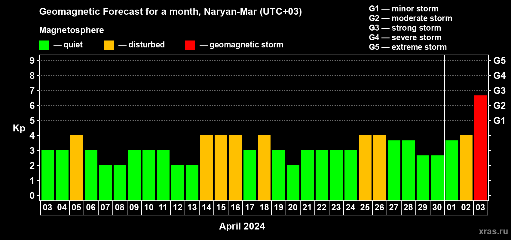 Geomagnetic storm forecast in Naryan-Mar for Apr 03, 2024