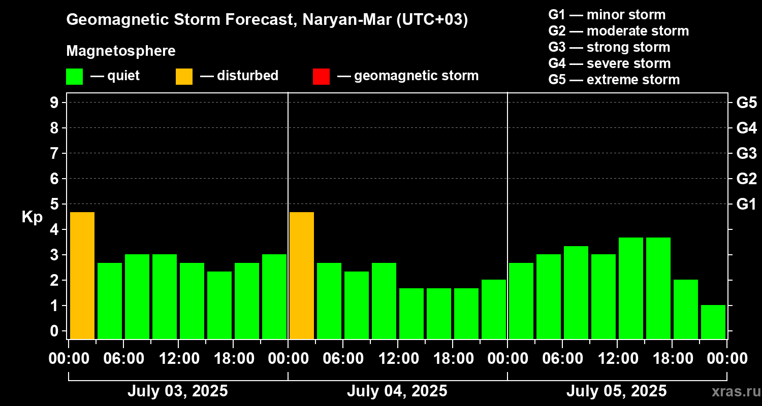 Geomagnetic activity forecast in Naryan-Mar — Jul 03, 2025