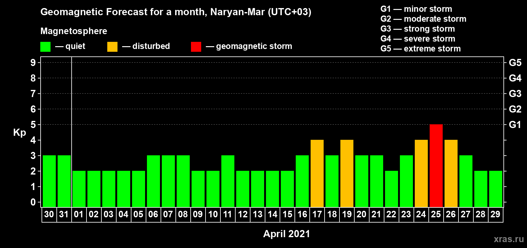 Geomagnetic activity forecast in Naryan-Mar — Mar 30, 2021