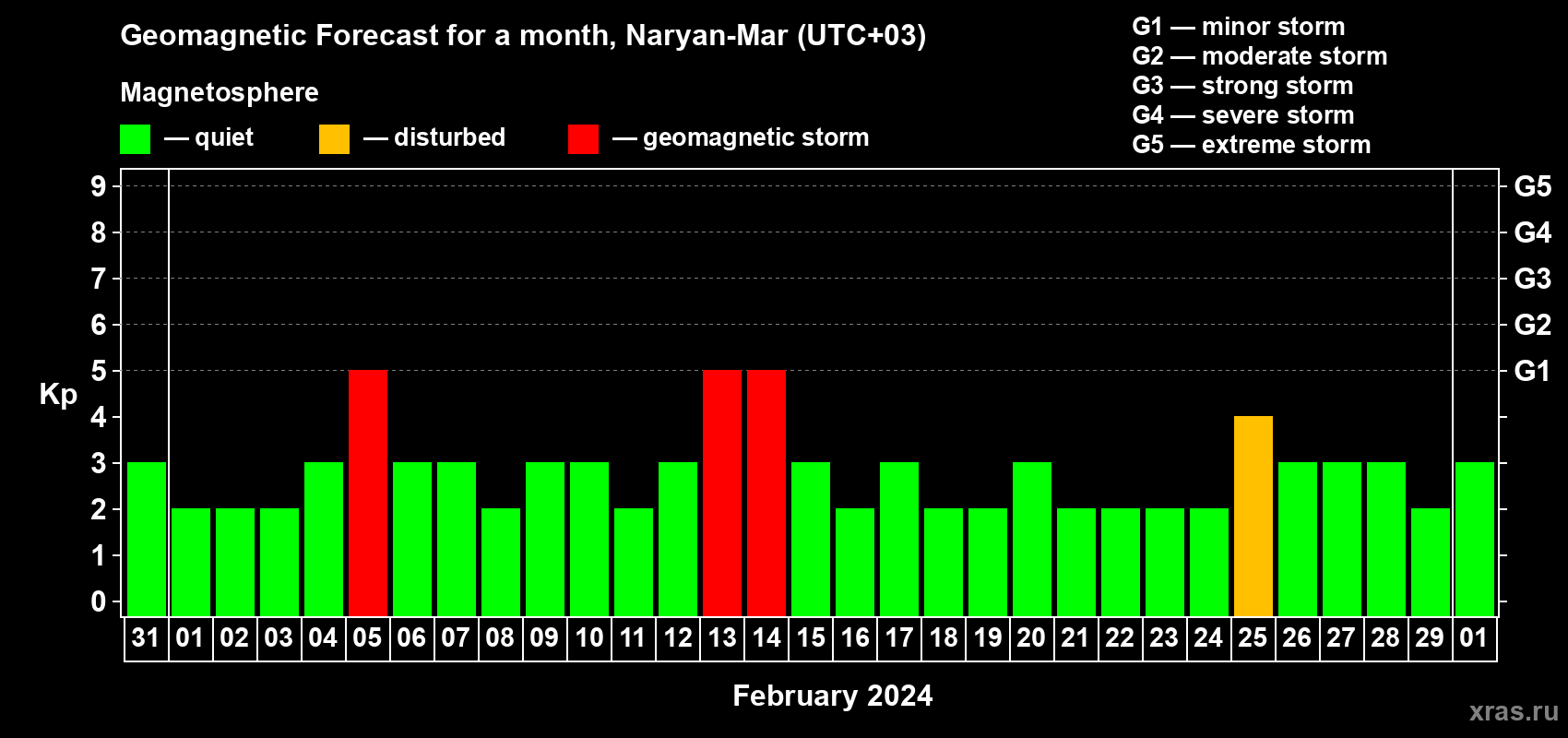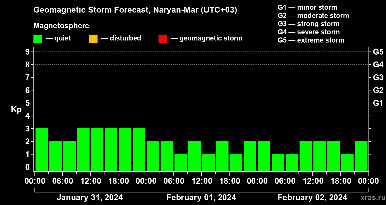 Geomagnetic activity forecast in Naryan-Mar — Jan 31, 2024