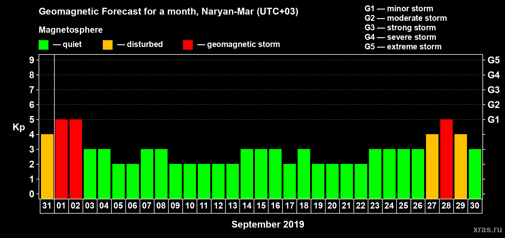 Geomagnetic storm forecast in Naryan-Mar for Aug 31, 2019