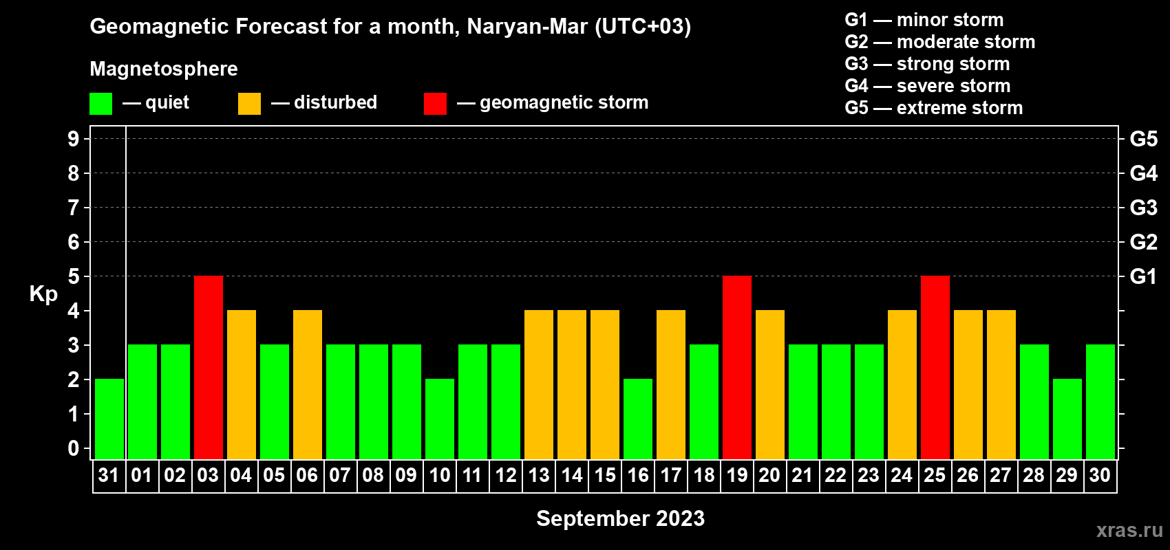 Geomagnetic storm forecast in Naryan-Mar for Aug 31, 2023