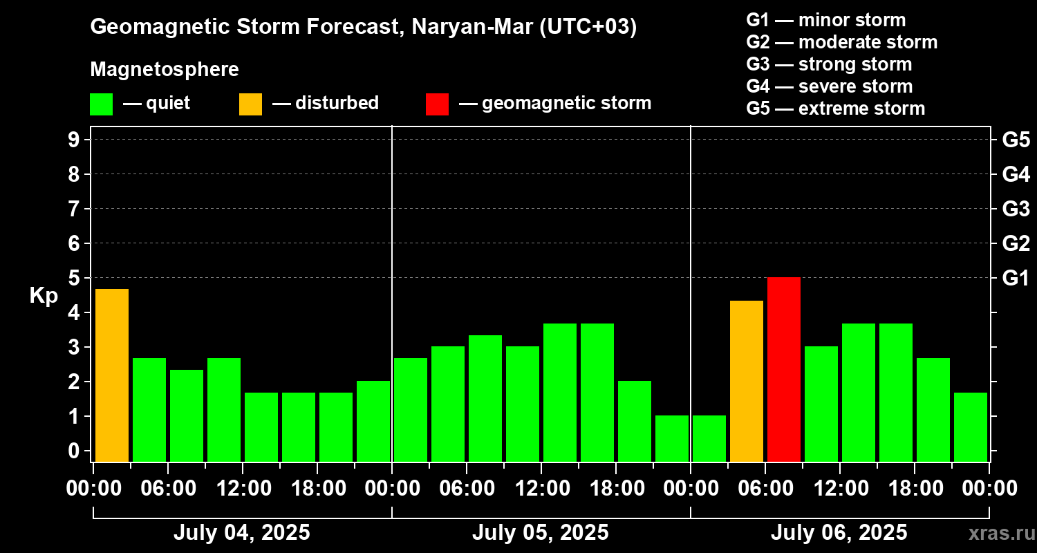 Geomagnetic activity forecast in Naryan-Mar — Jul 04, 2025