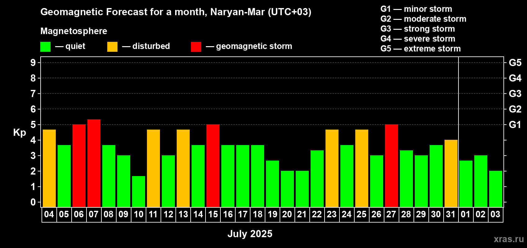 Geomagnetic storm forecast in Naryan-Mar for Jul 04, 2025