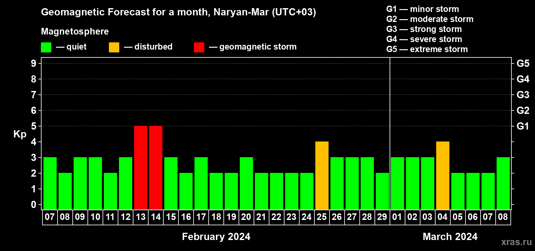 Geomagnetic activity forecast in Naryan-Mar — Feb 07, 2024