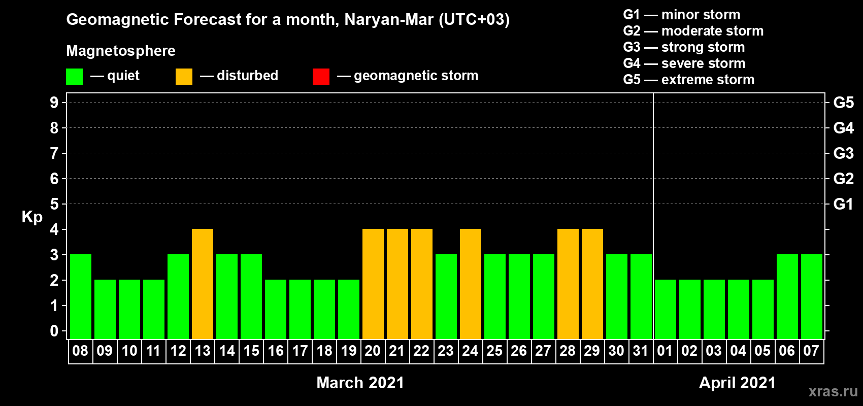 Geomagnetic activity forecast in Naryan-Mar — Mar 08, 2021