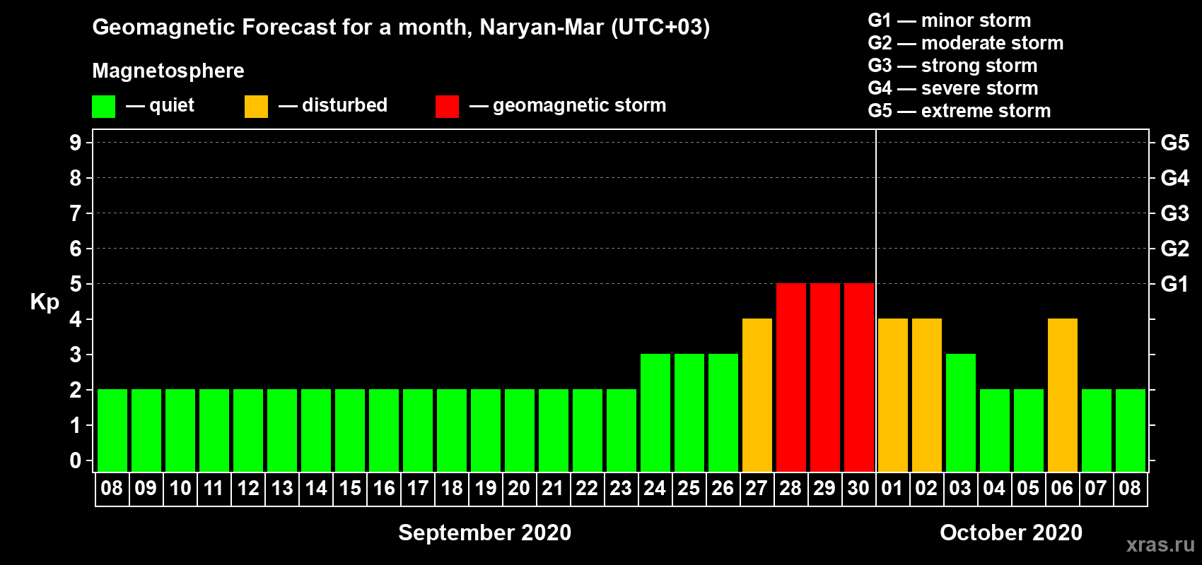 Geomagnetic storm forecast in Naryan-Mar for Sep 08, 2020