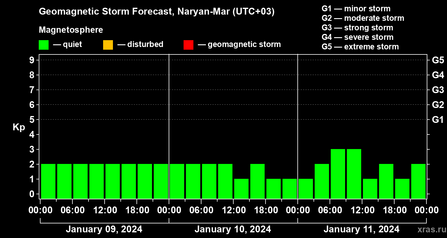 Geomagnetic activity forecast in Naryan-Mar — Jan 09, 2024