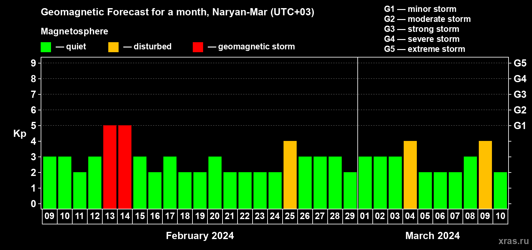 Geomagnetic storm forecast in Naryan-Mar for Feb 09, 2024