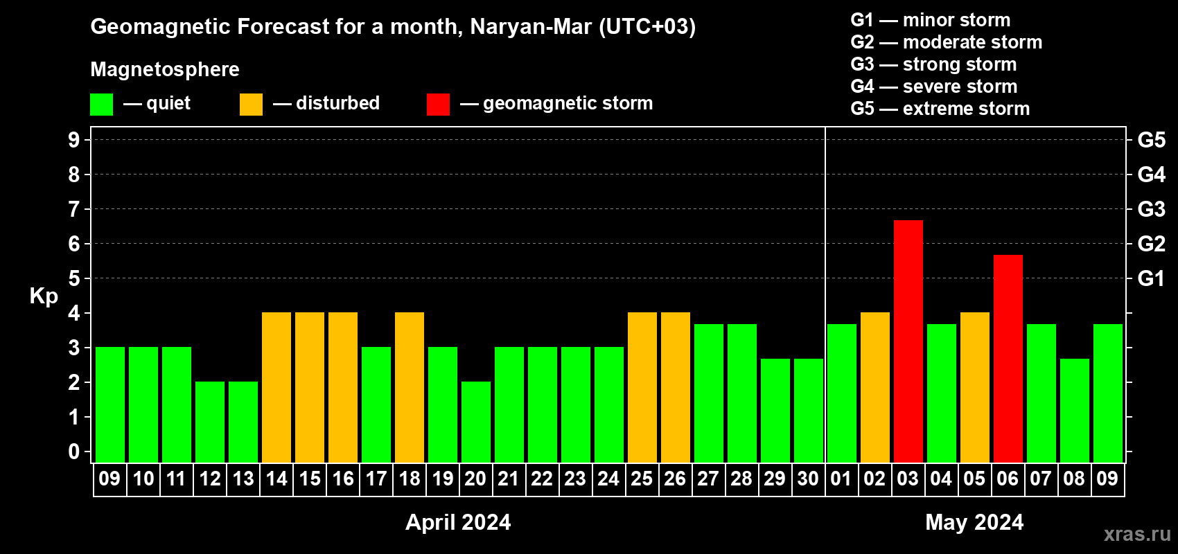 Geomagnetic storm forecast in Naryan-Mar for Apr 09, 2024