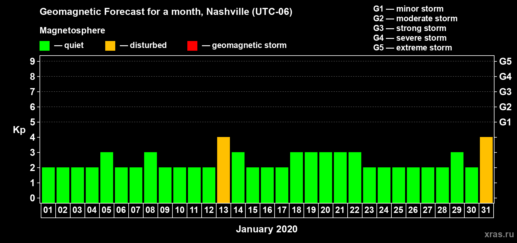 Geomagnetic storm forecast in Nashville for Jan 01, 2020