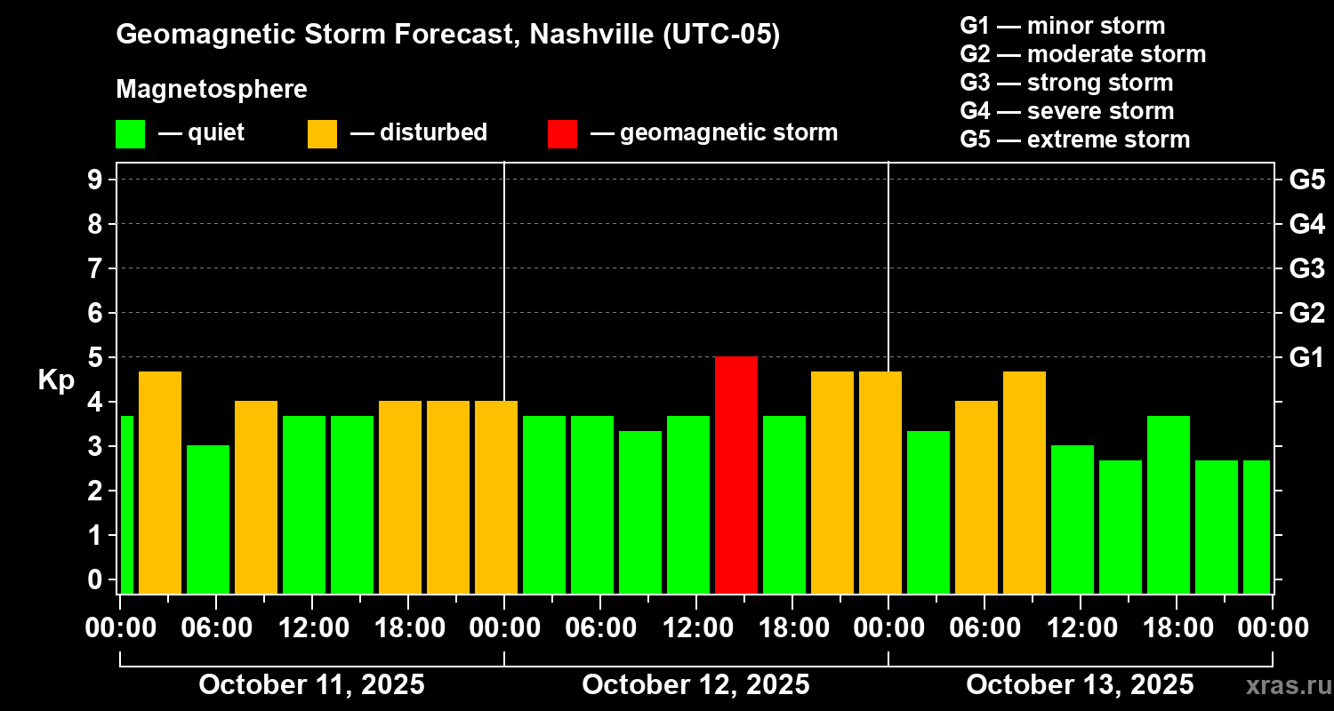 Geomagnetic storm forecast in Nashville for Oct 11, 2025