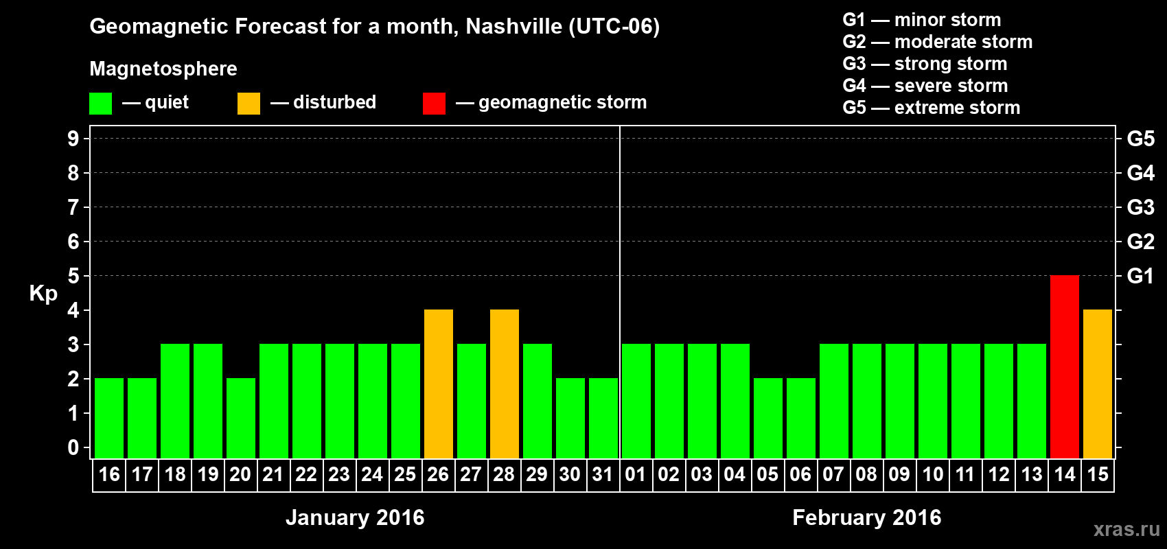 Geomagnetic storm forecast in Nashville for Jan 16, 2016