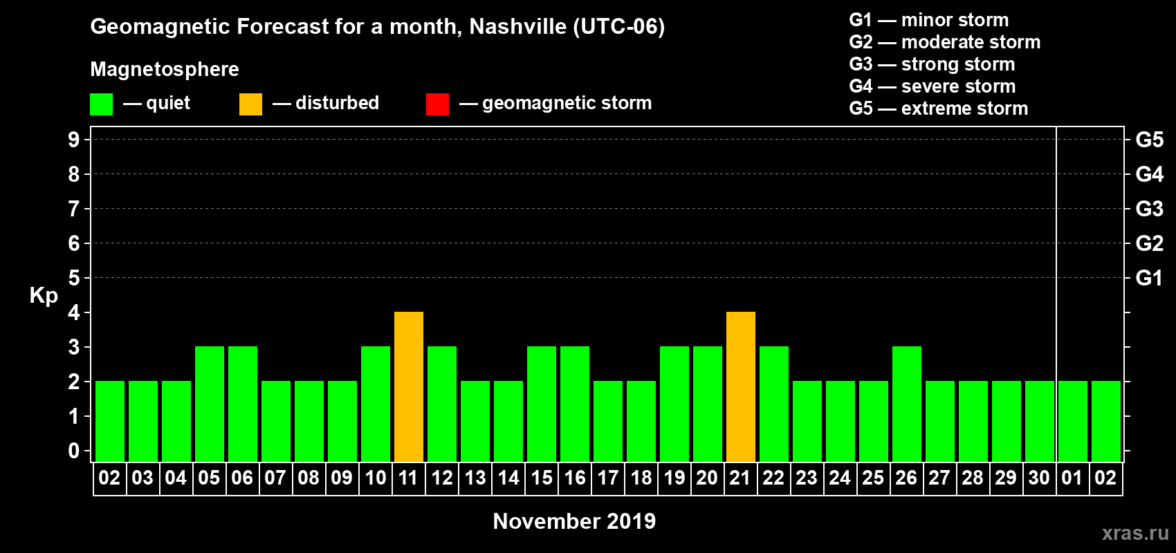 Geomagnetic storm forecast in Nashville for Nov 02, 2019