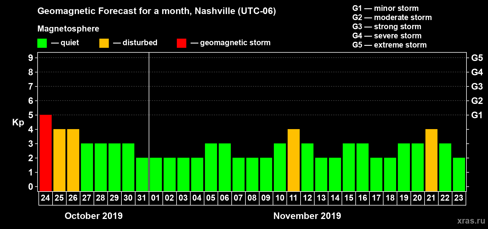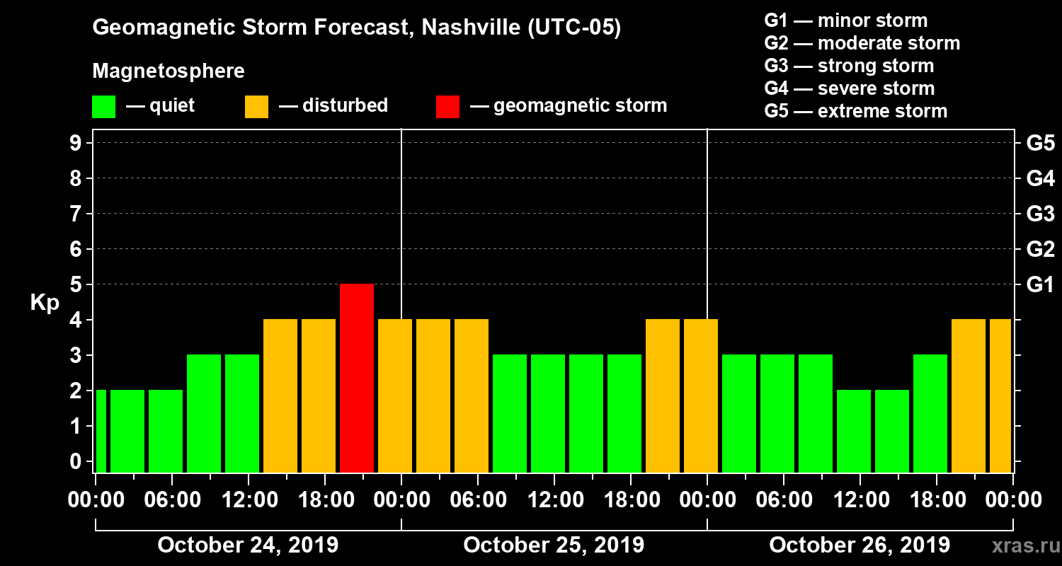 Geomagnetic storm forecast in Nashville for Oct 24, 2019