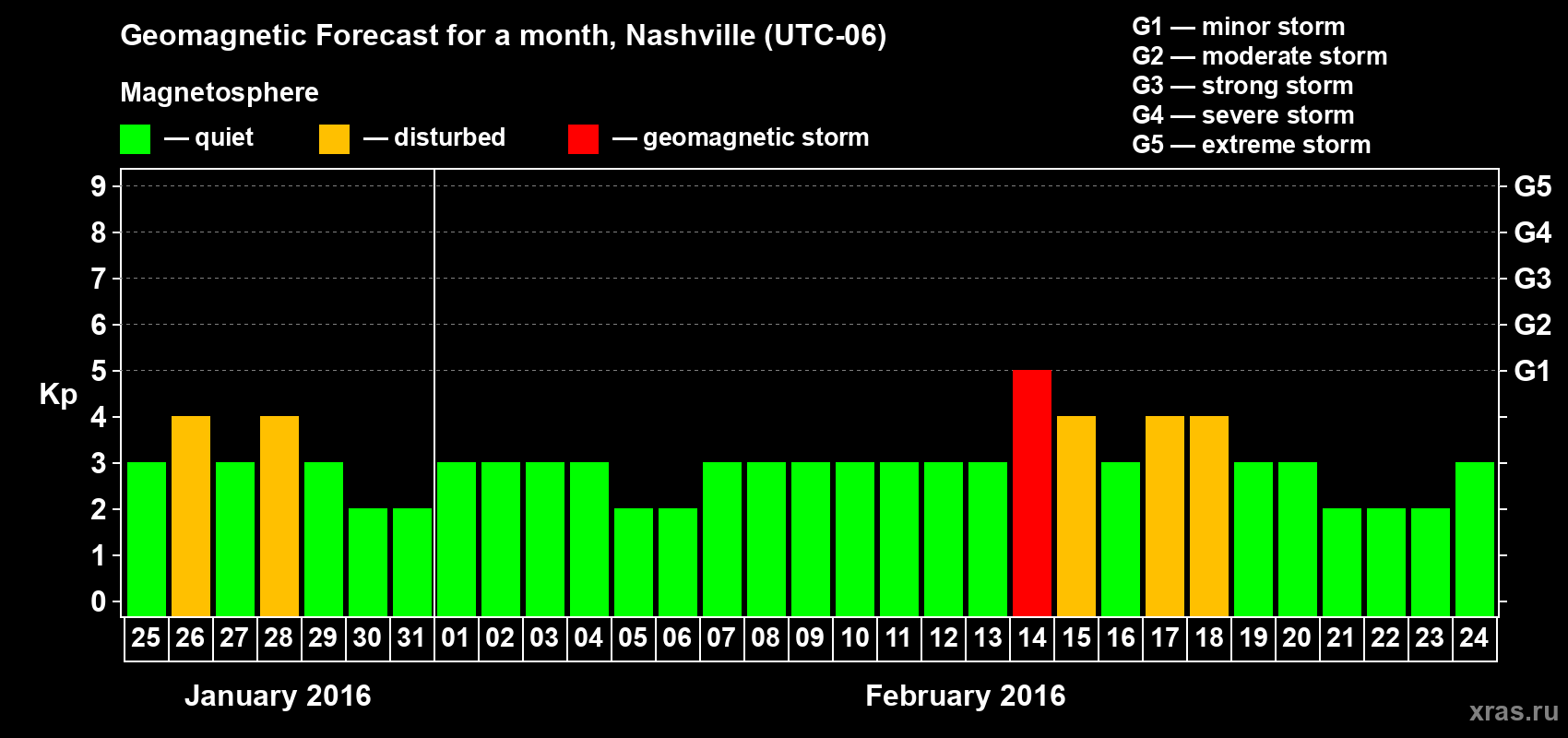 Geomagnetic storm forecast in Nashville for Jan 25, 2016
