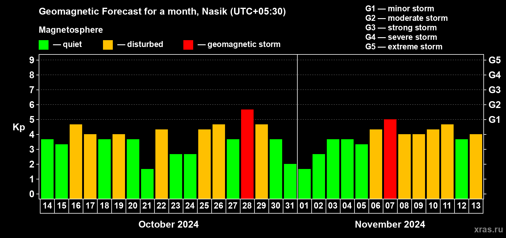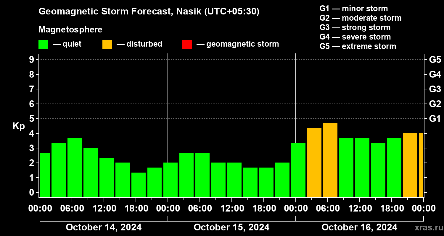 Geomagnetic storm forecast in Nasik for Oct 14, 2024