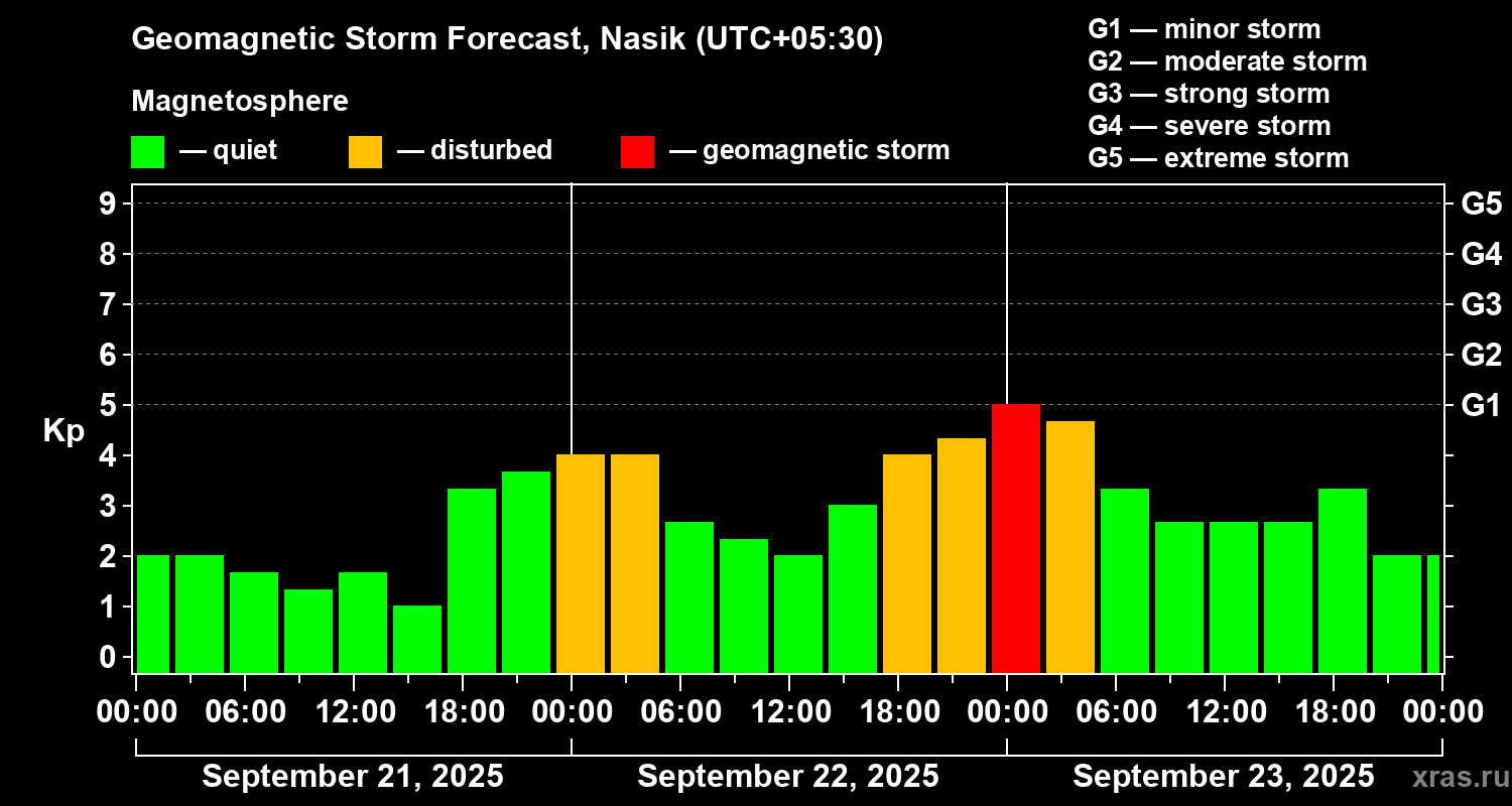 Geomagnetic storm forecast in Nasik for Sep 21, 2025