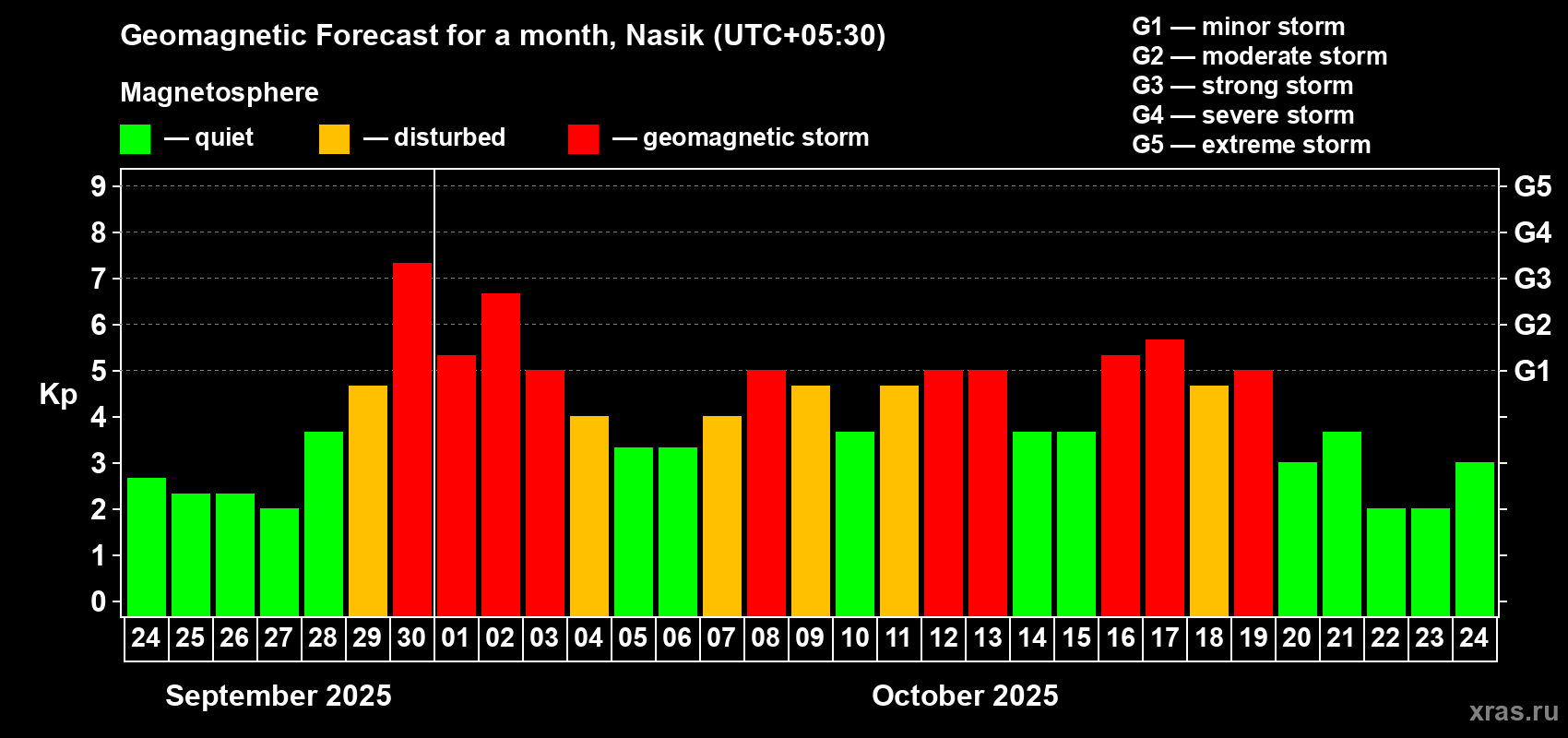 Geomagnetic storm forecast in Nasik for Sep 24, 2025