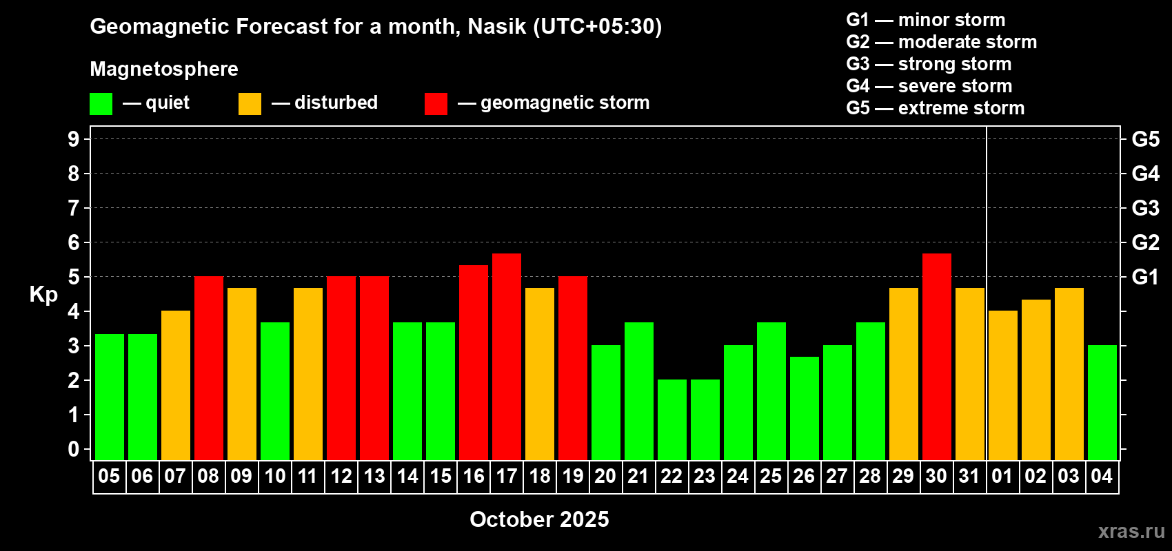 Geomagnetic storm forecast in Nasik for Oct 05, 2025