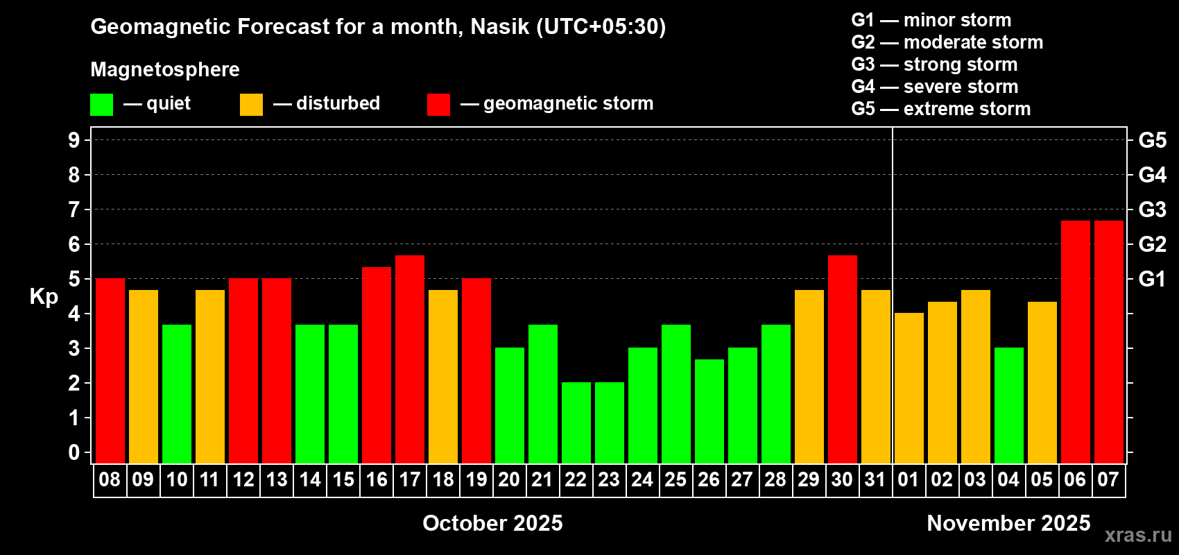 Geomagnetic storm forecast in Nasik for Oct 08, 2025