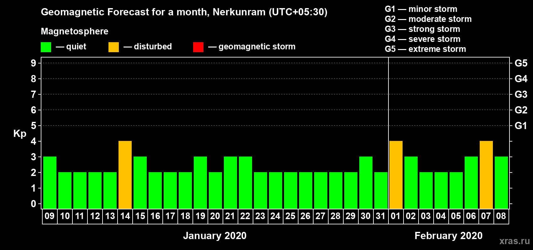 Geomagnetic storm forecast in Nerkunram for Jan 09, 2020