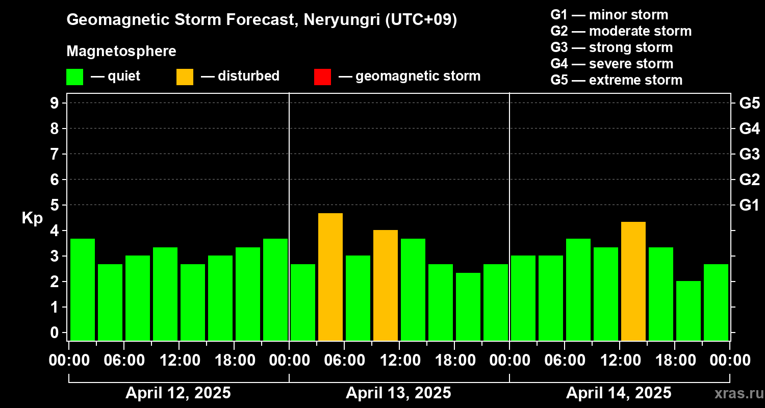 Geomagnetic activity forecast in Neryungri — Apr 12, 2025