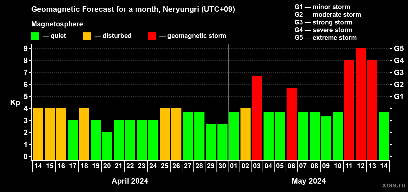 Geomagnetic storm forecast in Neryungri for Apr 14, 2024
